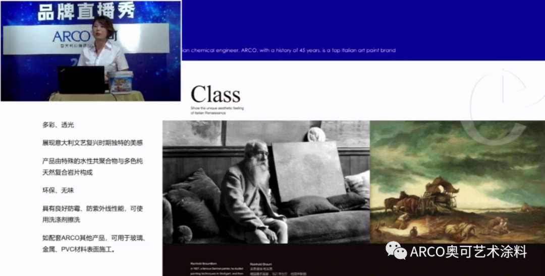 本次直播由意大利ARCO奥可(中国)CEO李井锋先生现场用一口流利的英语打开ARCO奥可艺术涂料的直播首SHOW模式。李总为大家详细介绍了ARCO奥可品牌的意大利背景、发展历程以及终端门店形象。同时还隆重揭晓了意大利ARCO奥可艺术涂料 “361°纯”的概念。