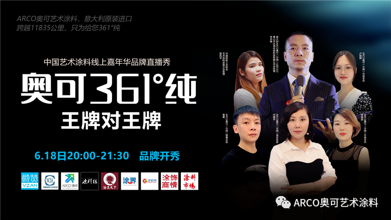 6月18日,高端艺术涂料品牌”意大利ARCO奥可”惊艳亮相中国艺术涂料线上嘉年华直播间,这是ARCO奥可进入中国市场的第一次线上公众展示。本次ARCO奥可直播主题为“361°纯. 王牌对王牌”,本次直播共吸引了约1.2万人次观看,直播间互动爆满,场面火爆。